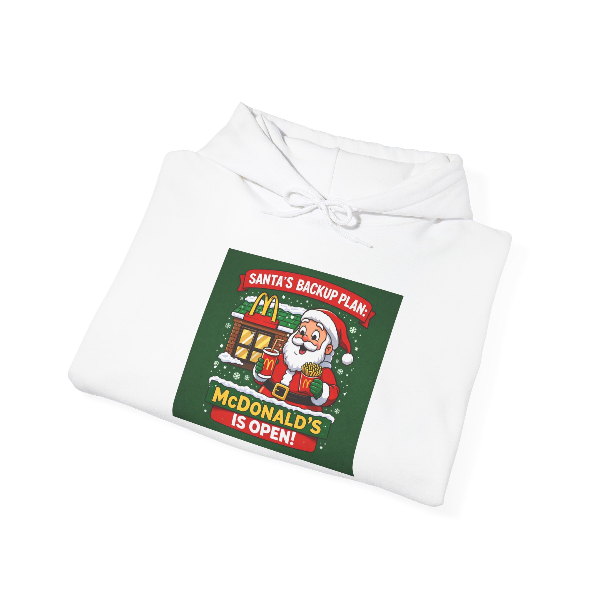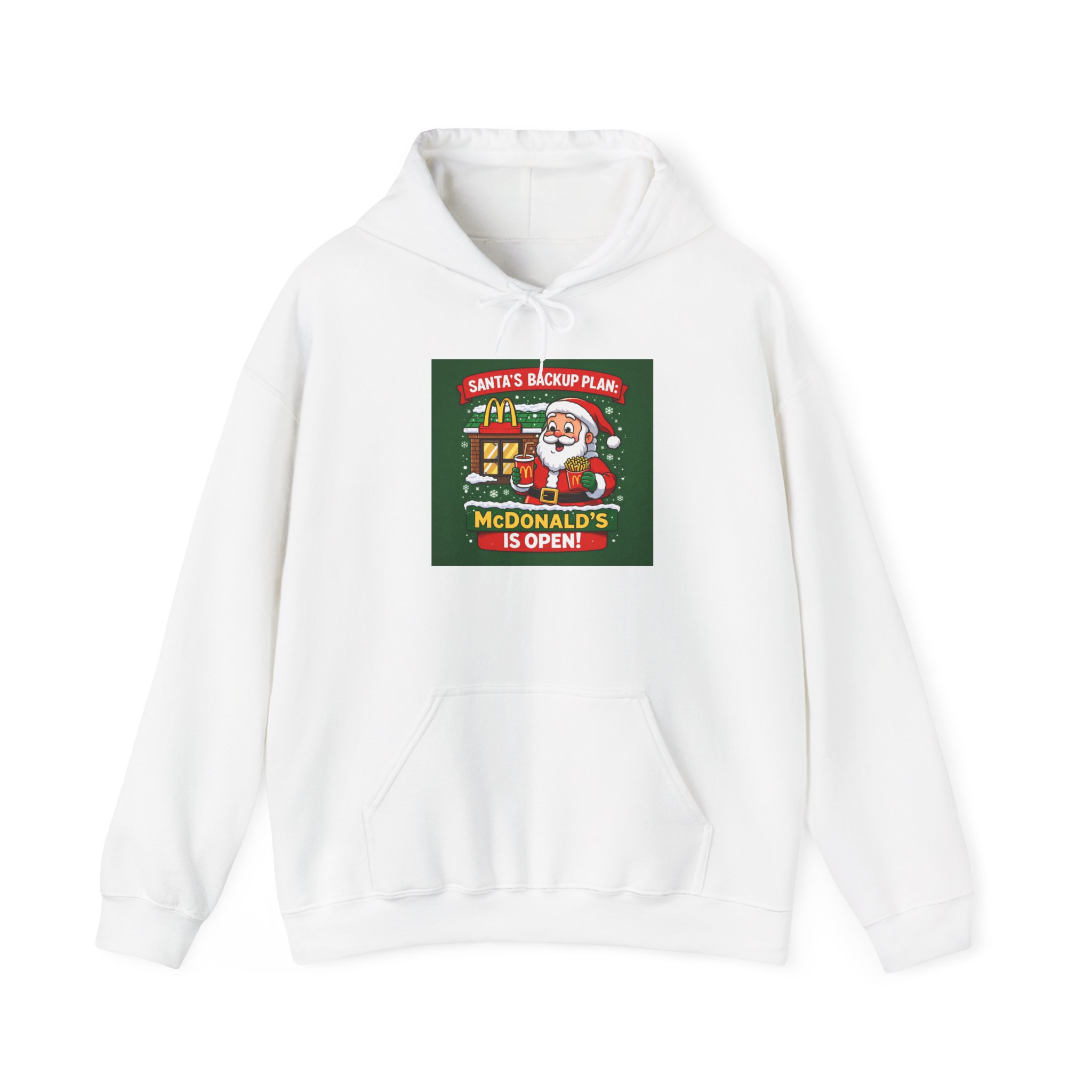 This cozy hooded sweatshirt brings playful holiday cheer with a bold, colorful front print of Santa next to a festive fast-food scene. The soft, medium-heavy 50/50 cotton-poly fabric holds print detail beautifully while offering warmth on crisp winter nights. The roomy kangaroo pocket, double-lined hood with color-matched drawcord, and classic fit make it an easy layer for casual outings, late-night runs, or relaxed gatherings by the fire. Subtle eco-conscious touches — OEKO-TEX-certified dyes and ethically sourced cotton — add reassurance for shoppers who care about materials and production. The design reads like a wink to anyone who loves a laugh during the holidays, slipping into everyday life without fuss.