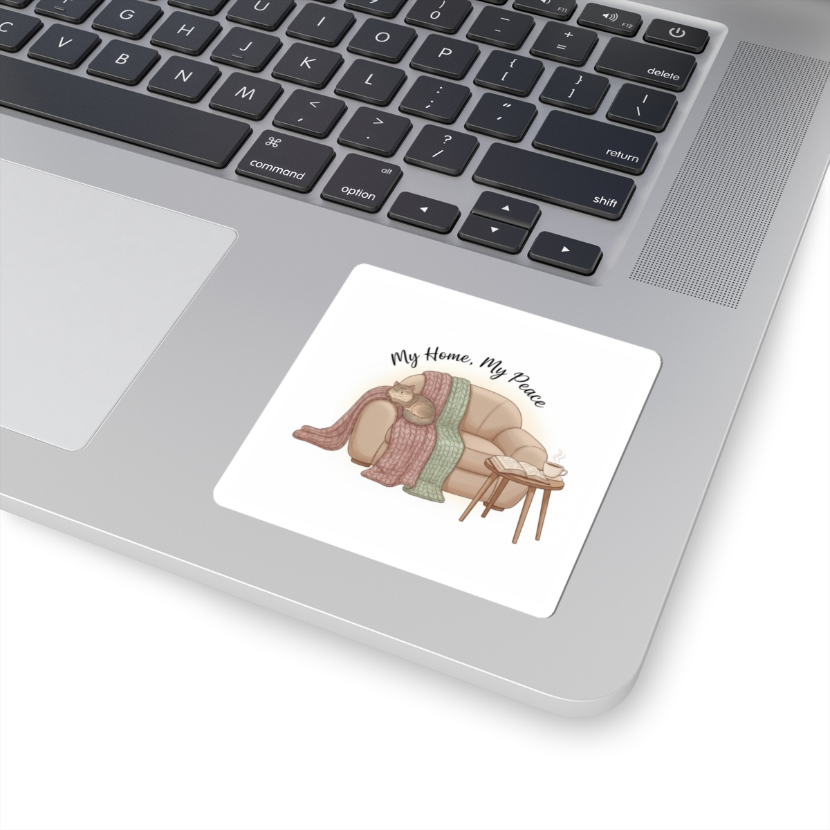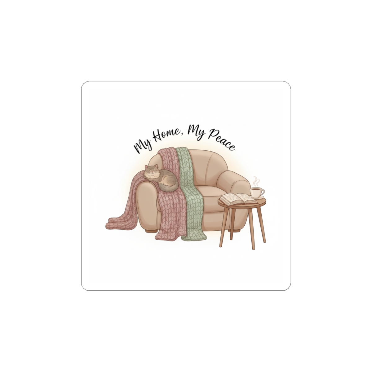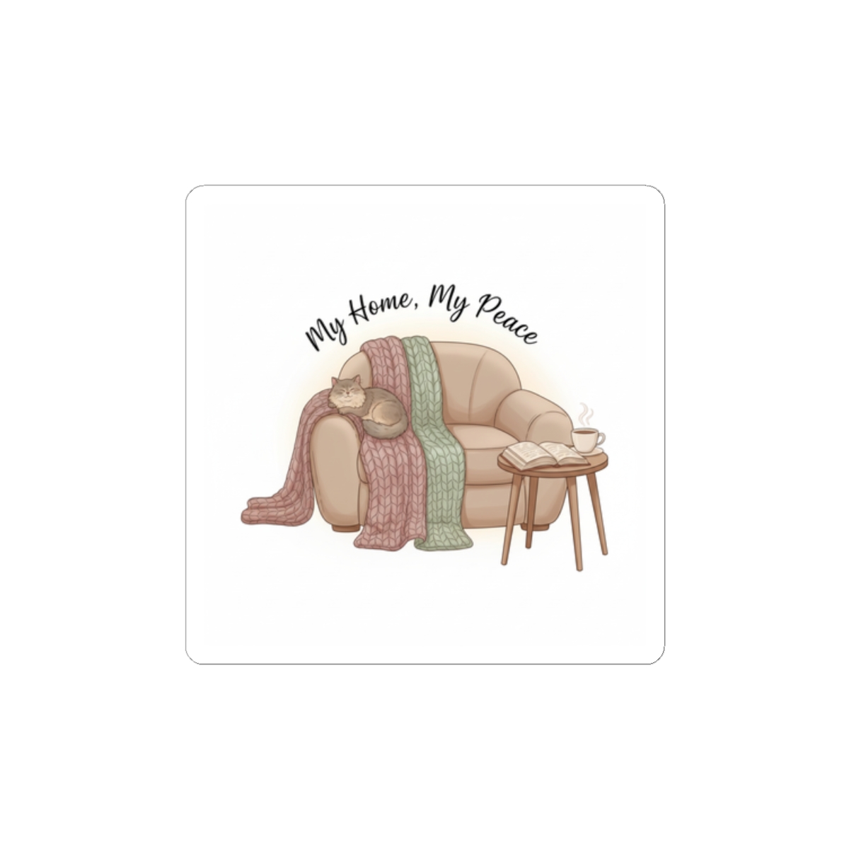 A small, cozy sticker featuring a softly illustrated armchair draped with chunky blankets, a steaming mug on a side table, and the calm affirmation “My Home, My Peace.” The muted warm-neutrals and gentle linework evoke quiet winter evenings spent reading or resting, matching the homebody/introvert winter aesthetic. Use it to personalize laptops, journals, or planners as a quiet reminder to protect one’s downtime.