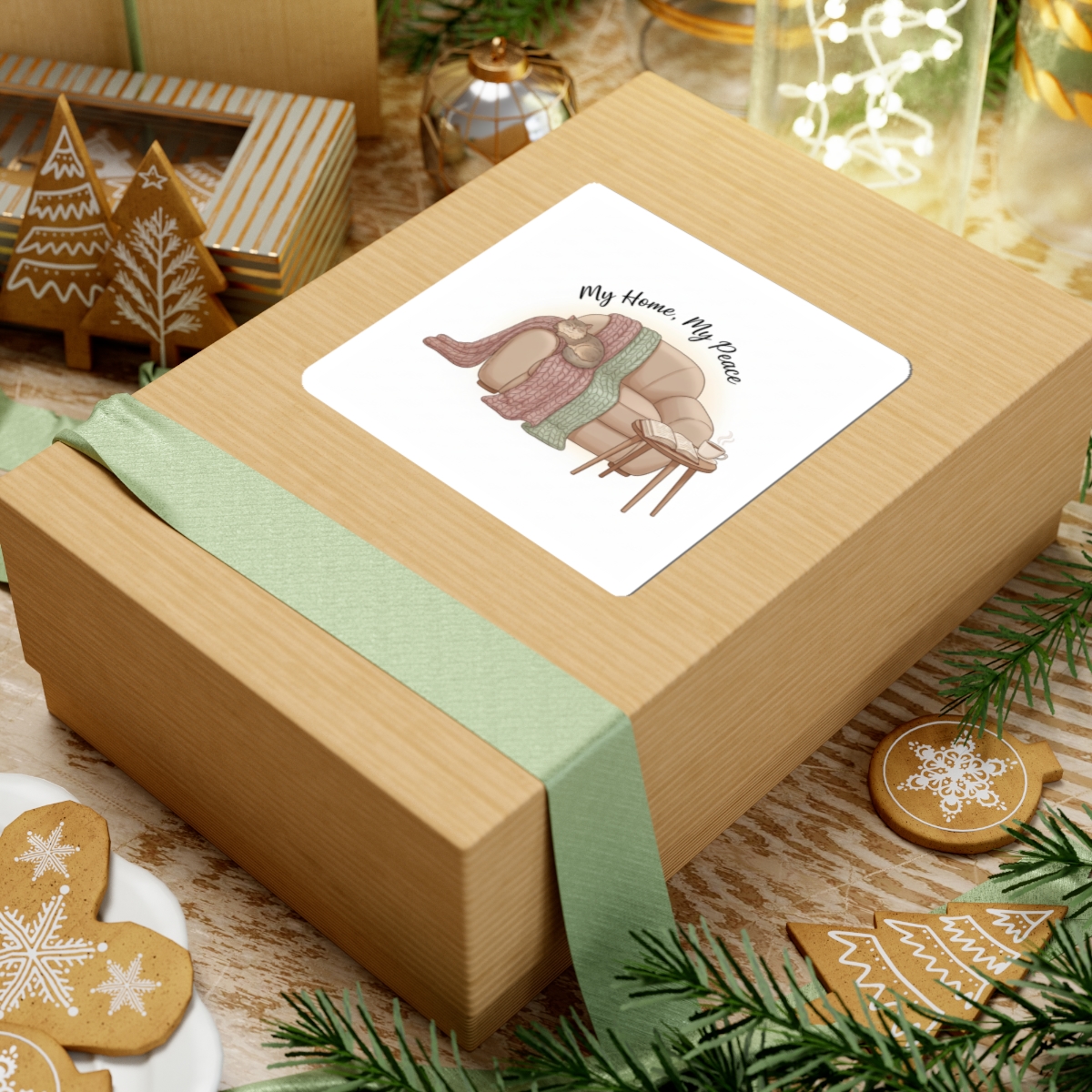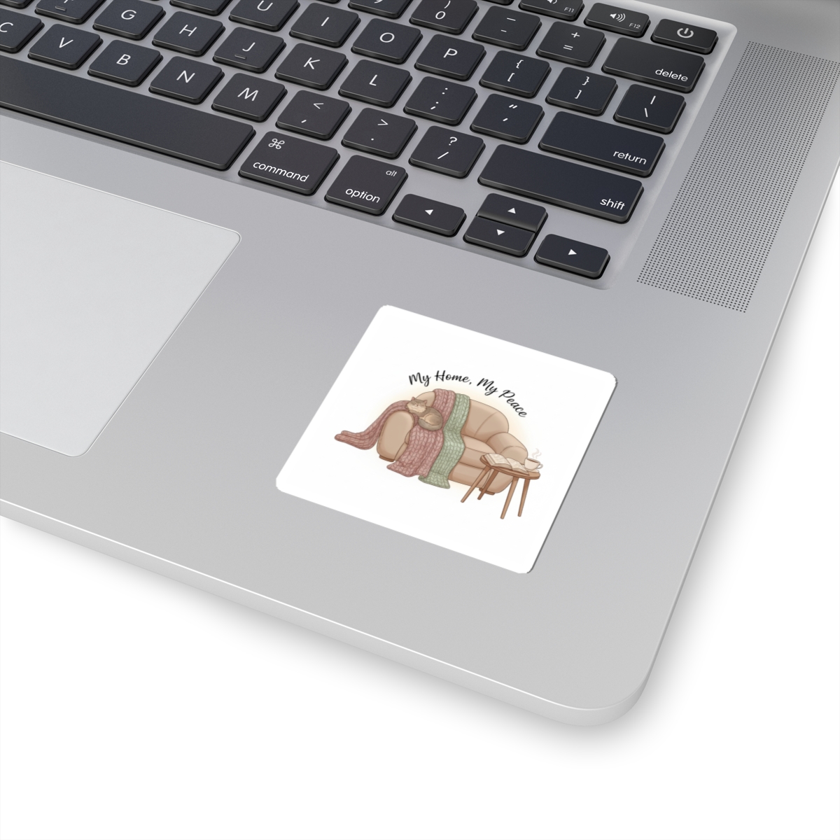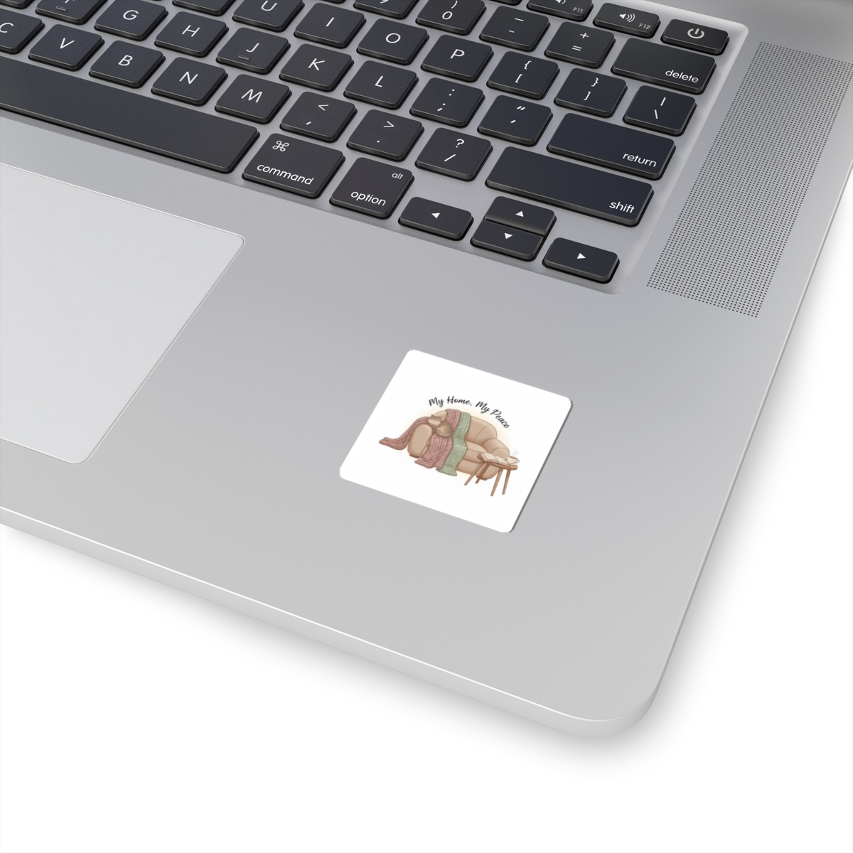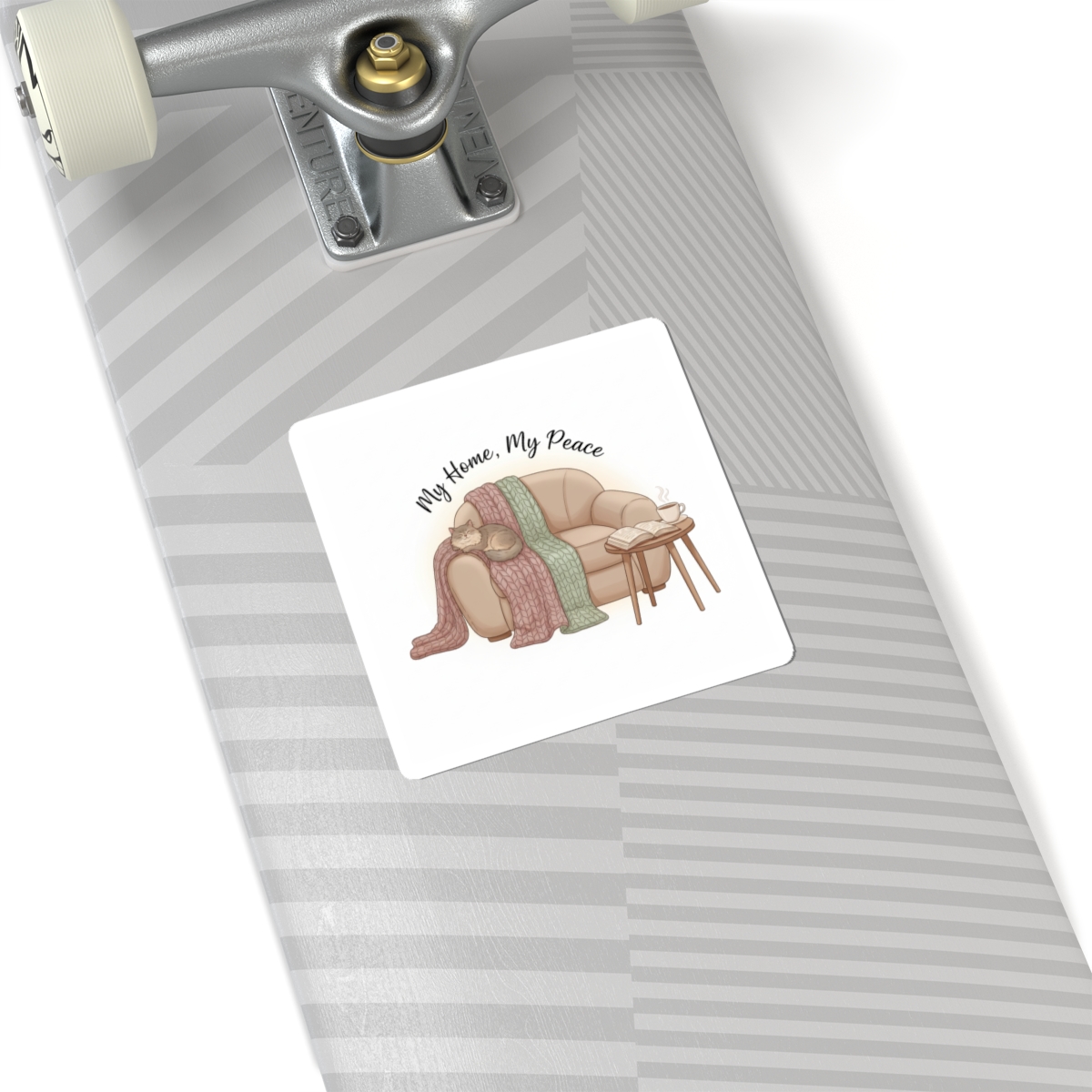 A small, cozy sticker featuring a softly illustrated armchair draped with chunky blankets, a steaming mug on a side table, and the calm affirmation “My Home, My Peace.” The muted warm-neutrals and gentle linework evoke quiet winter evenings spent reading or resting, matching the homebody/introvert winter aesthetic. Use it to personalize laptops, journals, or planners as a quiet reminder to protect one’s downtime.