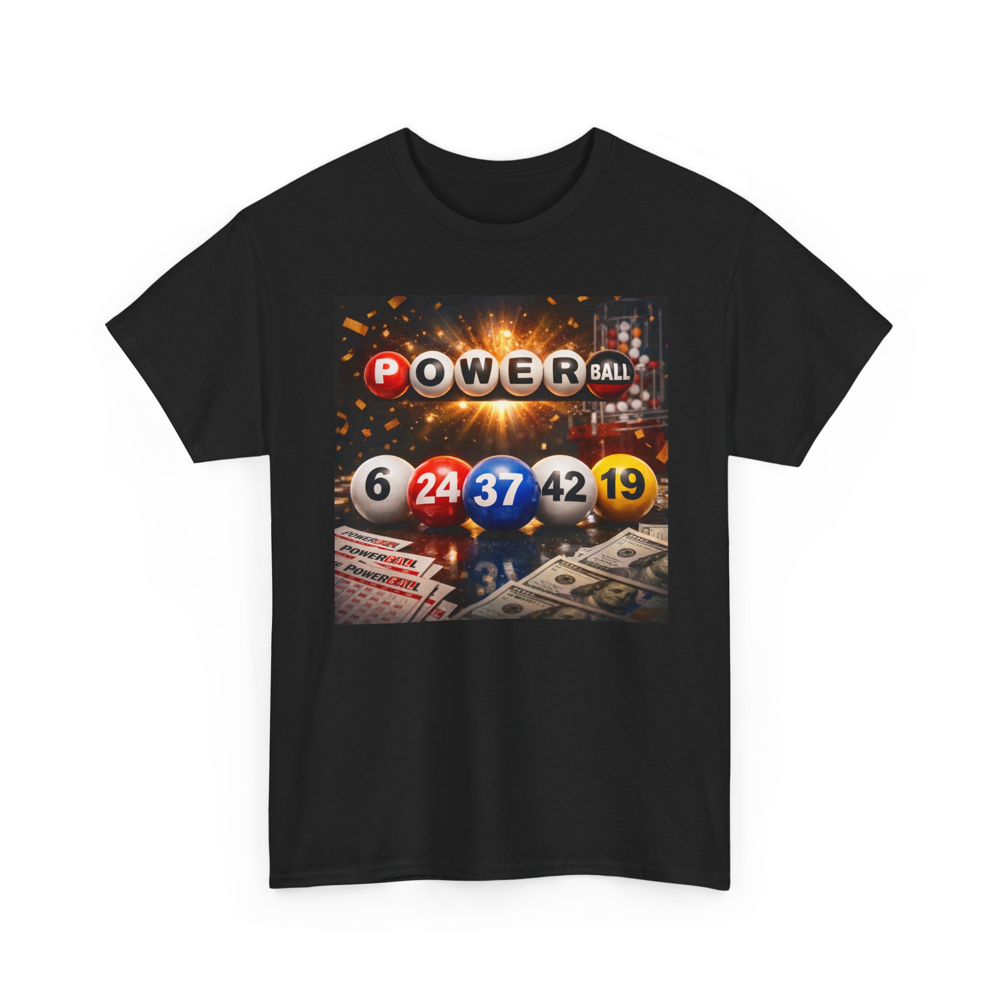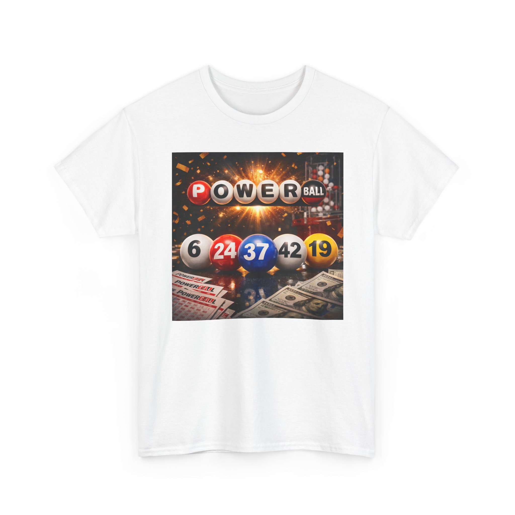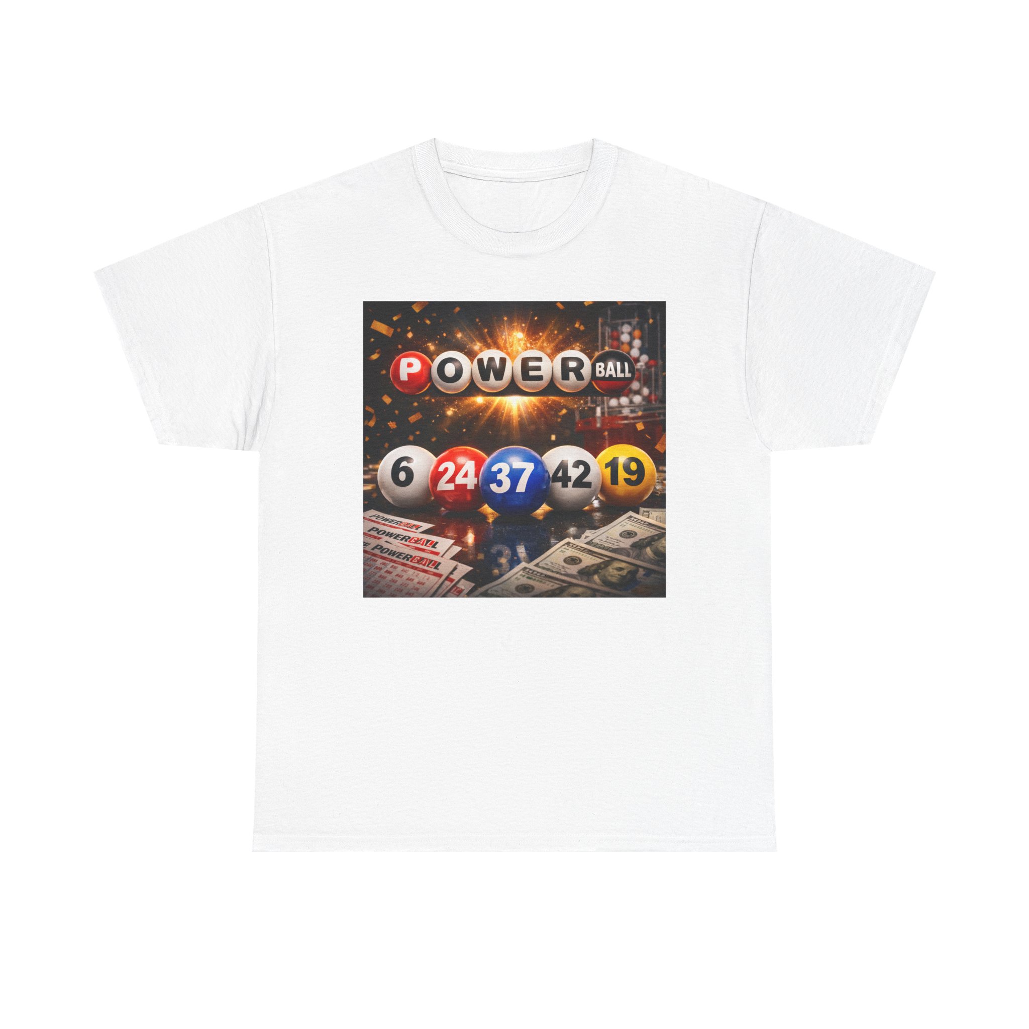 This relaxed, classic-fit tee captures the thrill of chasing a long-shot win. A bold front print features colorful lottery balls, numbers, and cascading cash—an energetic image that sparks daydreams of that one life-changing draw. Wear it to poker nights, lottery-pool meetups, or casual weekends when you’re feeling lucky. The soft, medium-weight cotton holds print detail well and keeps the shirt breathable across seasons. Simple, familiar, and a little cheeky—this tee slips into your rotation when you want to show off a playful streak without shouting for attention.