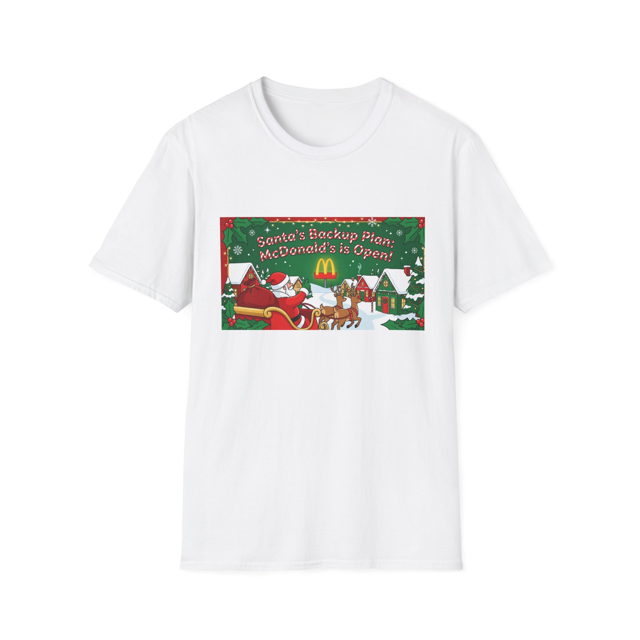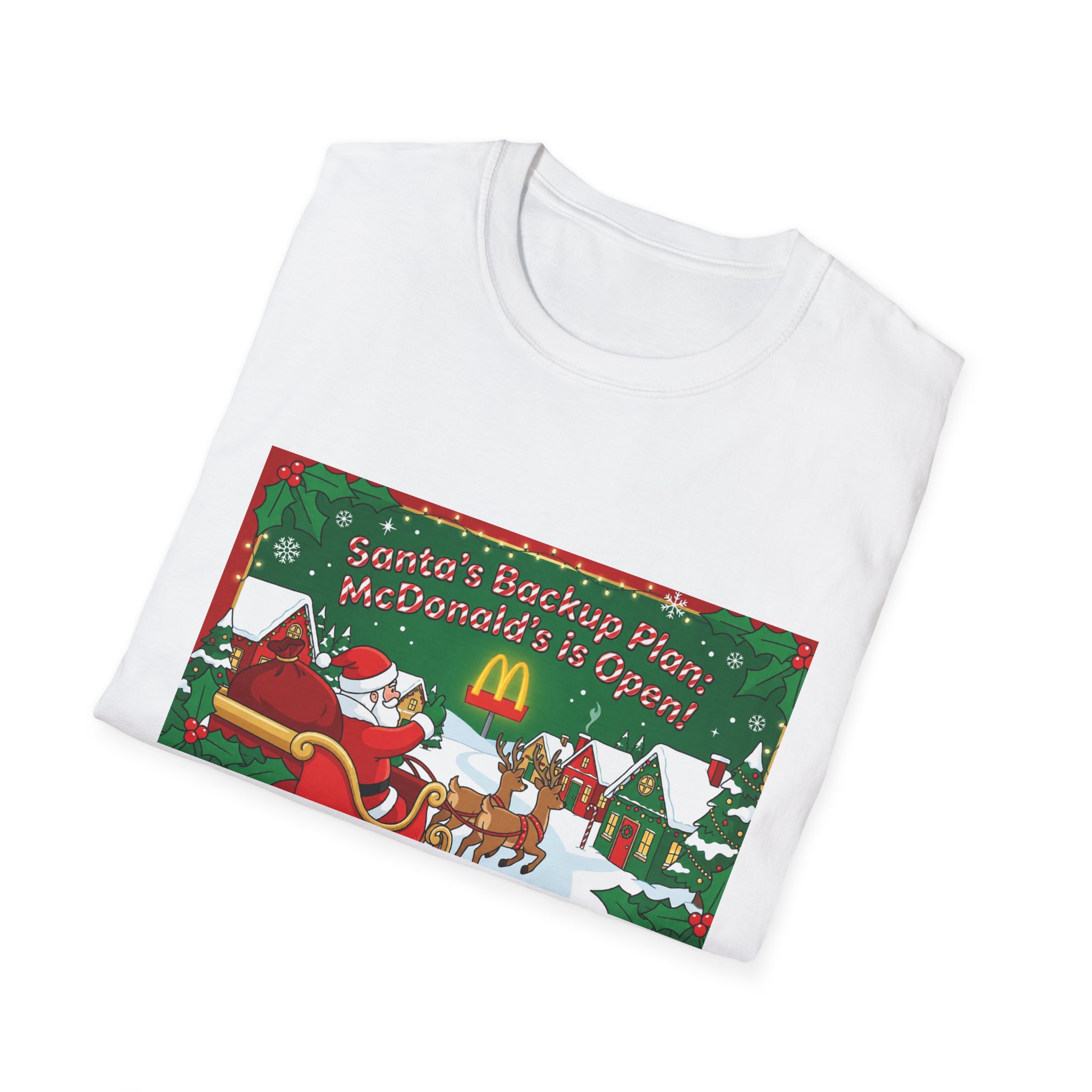 This lightweight cotton tee carries a wink of holiday mischief — a playful scene of Santa pausing his route, McDonald’s golden arches glowing like a late-night beacon. It feels like a cozy laugh with friends: soft against the skin, breathes easily, and sits in a classic crew silhouette so the art stays front-and-center. Wear it on relaxed winter evenings, while decorating the tree, or at casual gatherings where smiles and stories flow. The print’s bold colors pop on the clean white canvas, giving off a warm, nostalgic vibe that makes people lean in and chuckle.
