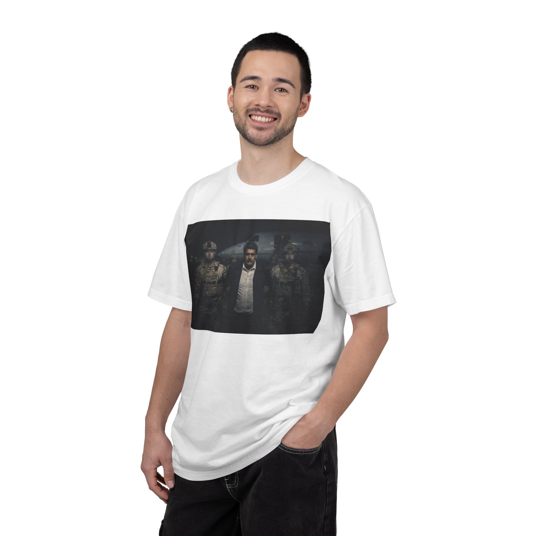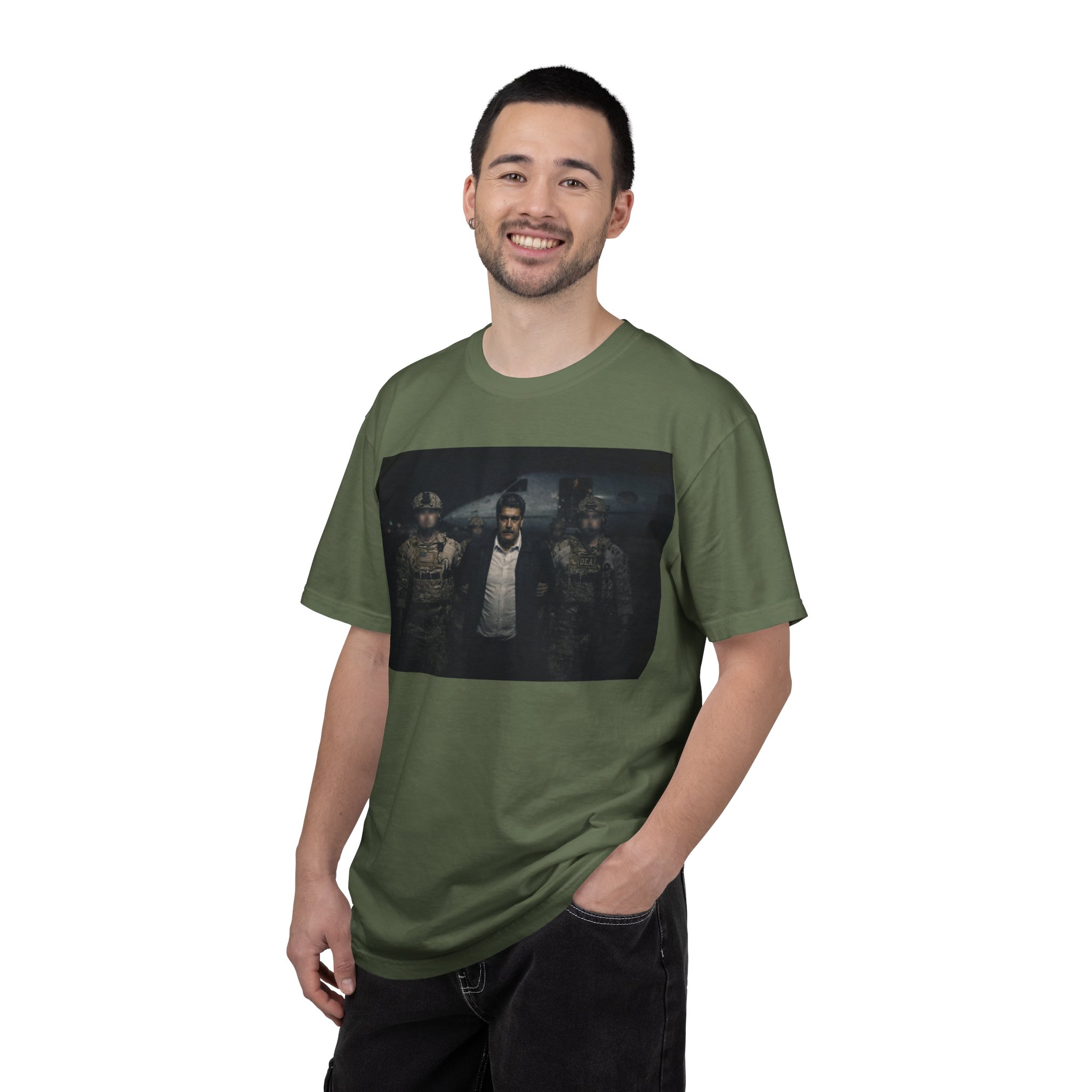 This heavyweight garment-dyed tee brings an edge to everyday wear. The relaxed fit and soft, post-dye finish create a lived-in feel from the first wear. A dramatic rectangular print on the chest evokes a tense, cinematic moment — three figures framed in low light — giving the shirt a moody, story-driven look that pairs naturally with worn denim or layered under a jacket. Built to last with double-needle stitching and tubular knit construction, it ages gracefully and keeps its shape after many wears. Wear it when you want clothing that looks collected, a little weathered, and quietly compelling.